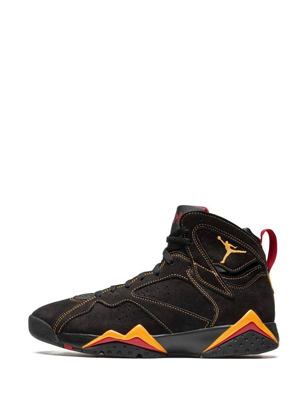 Nike’s Air Jordan 7 Retro “Citrus” sneakers feature a black Durabuck upper enhanced with citrus and red accents throughout. This model has a high-top silhouette and is detailed with the iconic Jumpman logo on the side and a ’23’ rubber patch set on a black and yellow background at the heel.